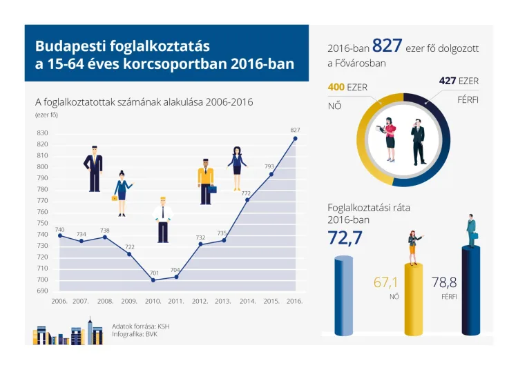 126 ezerrel többen dolgoztak Budapesten 2016-ban, mint hat évvel korábban