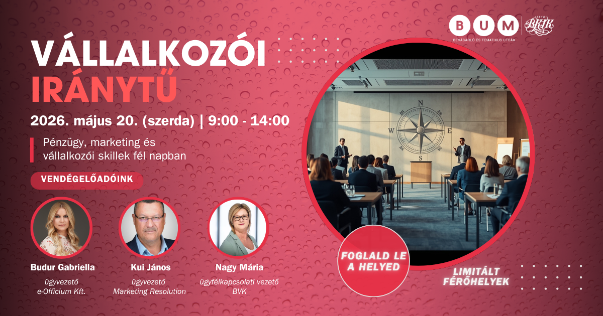 A Vállalkozói Iránytű egy fél napos, gyakorlati szemléletű nyílt nap, ahol a legfontosabb területeken kapsz iránymutatást: pénzügyek, marketing és vállalkozói működés.
